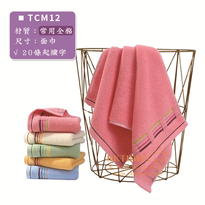 TCM007 毛巾選用常用純棉織造,是大眾接受度高嘅經典款式。佢嘅手感比市面上的平價禮品毛巾更柔軟扎實,吸水性亦更佳。本款毛巾採用4條色織帶作點綴,令純色嘅毛巾不再單調,既保持簡潔大方嘅風格,又增添咗一份設計感,非常符合多用途紀念毛巾嘅定位。